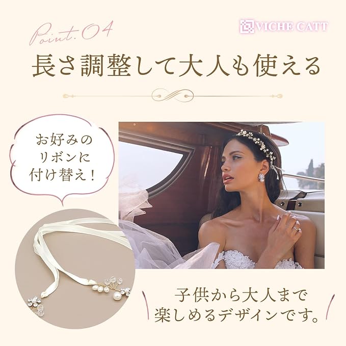 ヘッドドレスは左右のリボンで取り付け可能。お好みのリボンに付け替えて、様々なデザインやサイズを楽しんでいただけます。調整次第で子供から大人まで使えるデザインです。