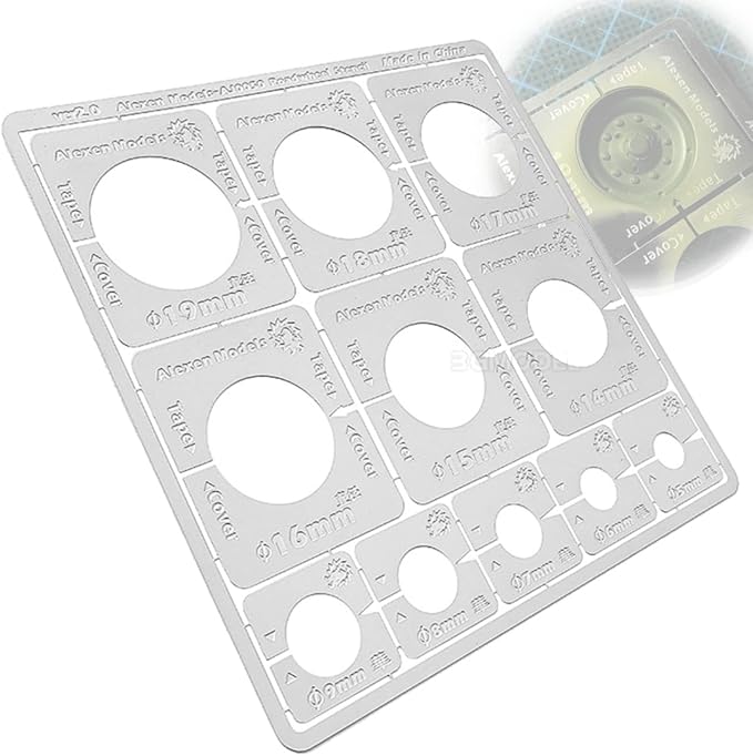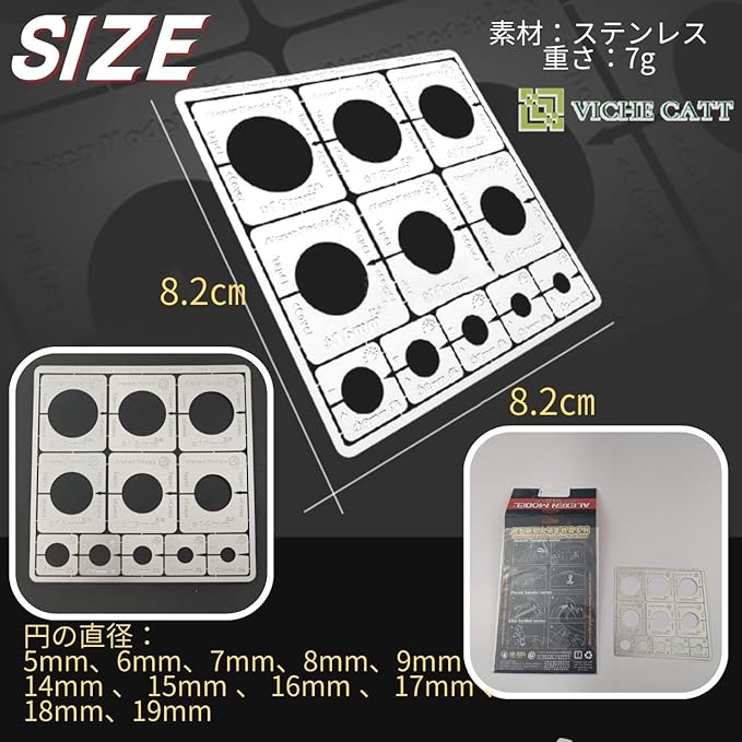 主に現用AFV車両(戦車、自走砲、装甲車等)向けになっています。 円の直径は、5㎜から9㎜までと、14㎜から19㎜まで、それぞれ1㎜刻みで合計11種用意されています。 様々な直径のテンプレートとなっているので、塗りたいパーツに合わせやすく、塗りムラも防いでくれます。 素材はステンレス製で、耐性が高く、そのうえ防錆効果にも優れているので、このマスキングテンプレート1つあれば長くご活用いただけます。