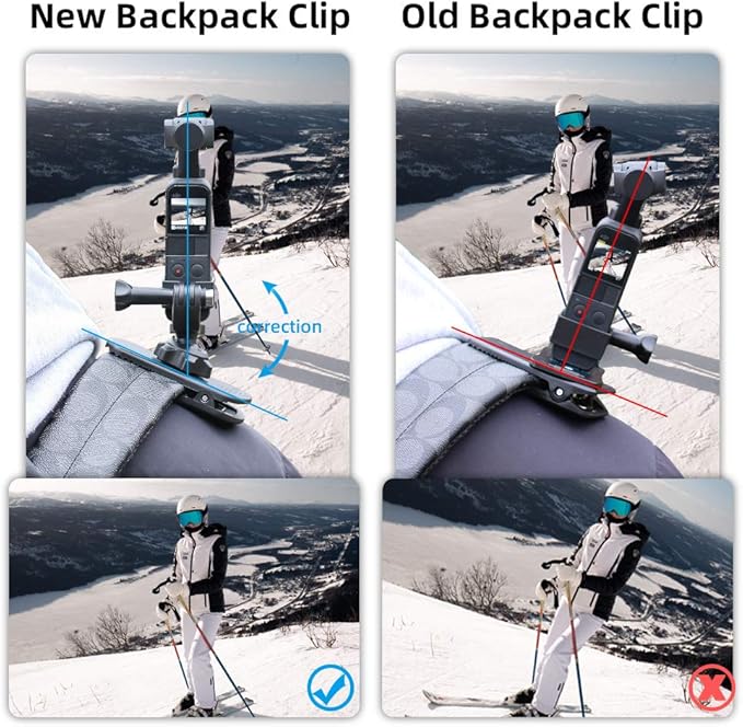 【新しいバックパッククリップマウント】-ボールジョイント設計により、360 の角度調整が迅速に実現。旧バックパッククリップでは不可能だった左右・上下の調整も可能。撮影角度の調整が簡単 水平および垂直の撮影を実現します。