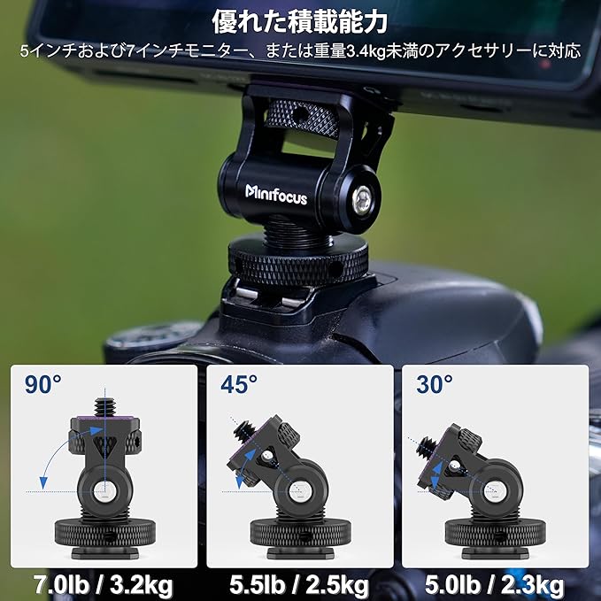 360 回転&160 チルト調整機能:フィールドモニターホルダーは360 回転と160 チルトを実現。ダンピング調整機能により、重量や角度に応じて精密かつ柔軟な位置決めが可能です。90 チルト時の耐荷重は3.2kg、45 チルト時は2.5kg、30 チルト時は2.3kgです。