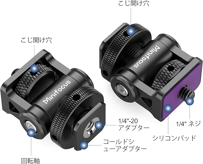 幅広い互換性:カメラモニターマウントの底面には1/4インチネジ穴付きコールドシューを装備(底面の1/4インチネジを外すと、3/8インチネジ穴付きコールドシューが現れます)。カメラのホットシューや、カメラケージ・ハンドルなどのカメラリグ用シューマウントに適合します。