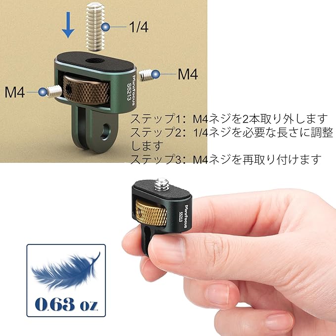 標準1/4インチネジ:1/4"-20ネジを付属。GoProマウント、三脚、自撮り棒、ほとんどのカメラとの接続に便利。この変換アダプターはカメラを任意の角度で固定し、様々な方向の風景撮影に対応、多様なニーズを満たします