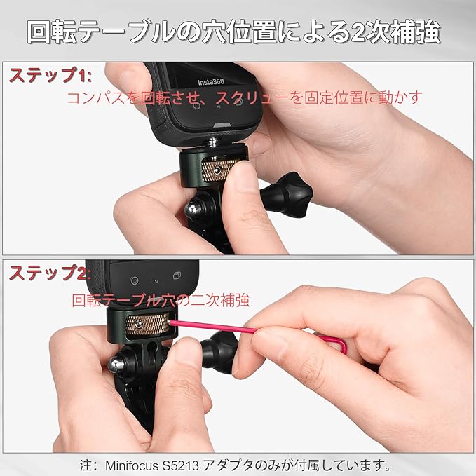 ロックリング&回転穴:ネジ部とアダプター部の分離設計により、ロックリングがカメラ底面と密着。マウント位置を正確に調整でき、カメラの緩みを防止。さらに回転穴が構造を強化し、追加のロック機構を提供