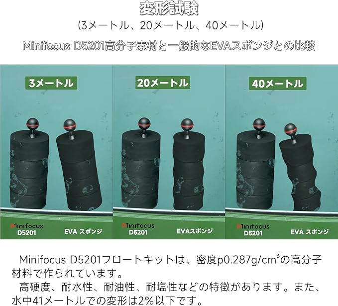優れた浮力: 当社の水中浮力キットは、高密度、高硬度、強力な圧縮強度特性により、高い浮力を提供するように設計されています。最大5バールの水圧に耐え、水中41mで変形することなく2%以下の変形率、最大深度50 m/164 ftまで耐えられます