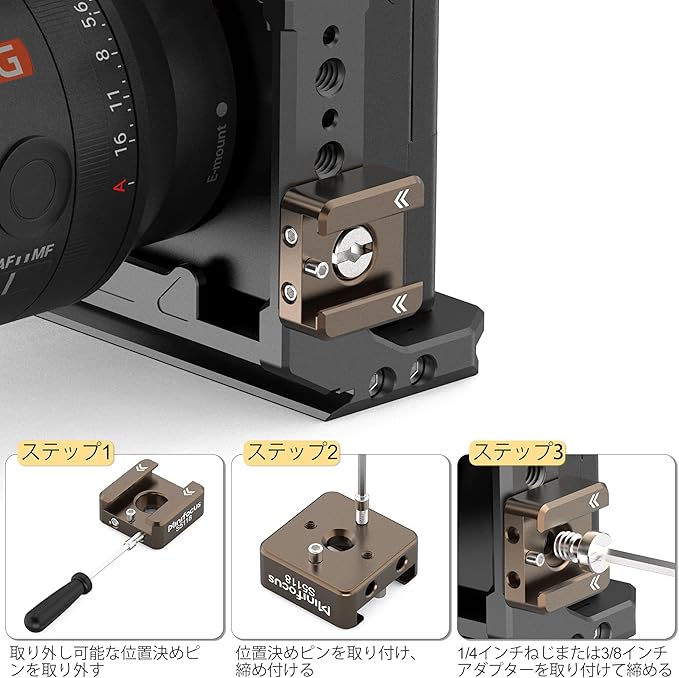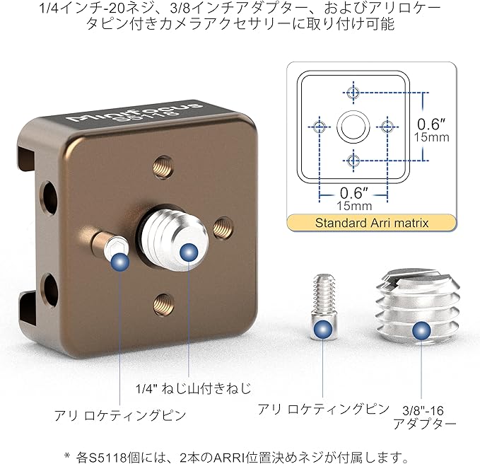 MINIFOCUS コールドシューマウント(2個セット)、位置決めピン付き1/4「-20ネジ、ARRI標準マウントポイント対応、カメラケージ・フラッシュ・LEDモニター・マイク用3/8」-16アダプター付属