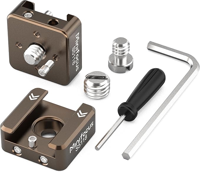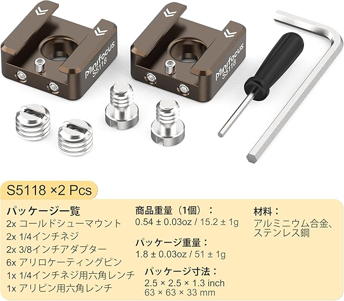 パッケージ内容:コールドシューマウント 2、1/4インチネジ 2、3/8インチアダプター 2、アリピン 6、1/4インチネジ用六角レンチ 1、アリピン用六角レンチ 1。アルミニウム合金製ボディながら1個あたりわずか0.47オンス/13.4g(3/8インチアダプター除く)。コンパクト設計でポケットやカメラバッグに簡単に収納可能。