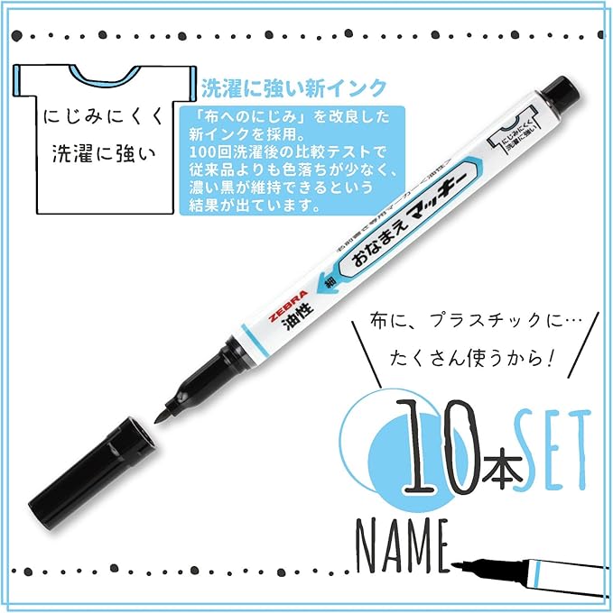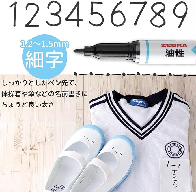 特に衣類(ハンカチ・ワイシャツ・体操着・運動靴など)の名前書きに適しています。ビニール、プラスチック、金属、革、ガラス、紙などにも利用可能。浮き輪などの軟質塩化ビニール製品には適さない。