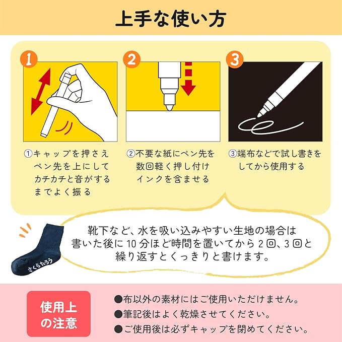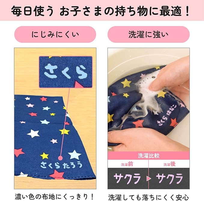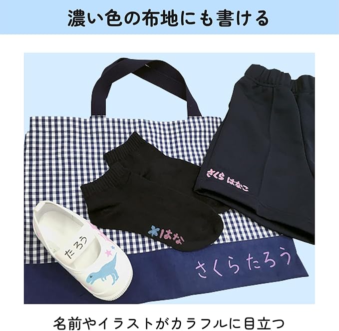 布、ビニール、金属、プラスチックなど、様々な素材への名前書きに最適