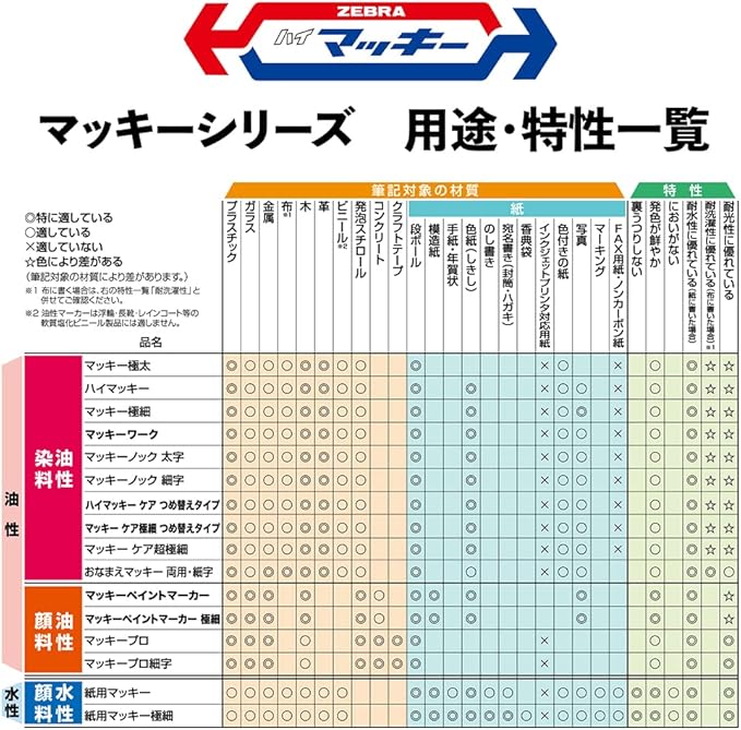 速乾性・耐水性で、紙・布・木・ダンボール・ガラス・プラスチック・金属・ビニール類などに幅広く利用できる。(浮輪等の軟質塩化ビニール製品には適しません。)
