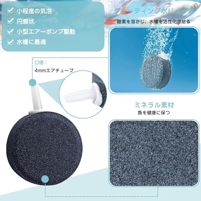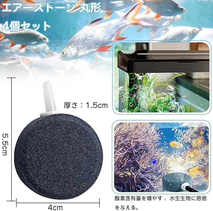 セット内容:エアーストーン4個セット;形状:丸型;高さ:5.5cm;厚さ:1.5cm;材質:砂岩;対応エアーポンプ:小型・中型エアーポンプ;口径:4mmエアチューブ