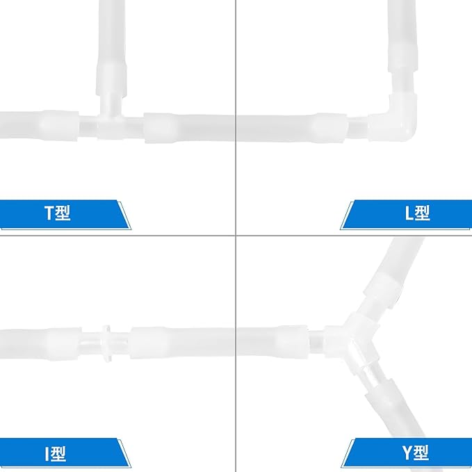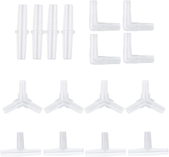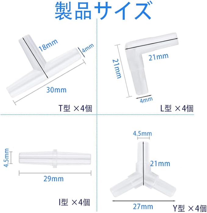 【セット内容について】 このエアーチューブコネクターセットには、透明なL型(4個)、I型(4個)、Y型(4個)、T型(4個)の各接続部品が含まれており、エアチューブの延長や複数のラインへの分岐を自由に組み立てられます。