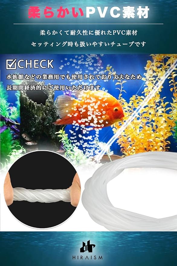 【柔らかいPVC素材】柔らかくて耐久性に優れたPVC素材を使用しているため、セッティング時も扱いやすいチューブです。水族館などの業務用でも使用されており丈夫なため、長期間経済的にご使用いただけます。