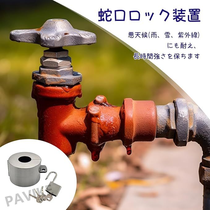 【複数キー付きでセキュリティ性の高い戸外蛇口錠、盗難防止に最適】付属の鍵を使用して簡単にロック・アンロックできる水栓錠は、キーレスタイプの煩わしさがなく、紛失リスクも抑えられます。この水道蛇口ロックにより、不正な水の使用や不用意な水の流出、意図的ないたずらを防ぎ、ホームタンクや門扉水栓を強力に保護します。