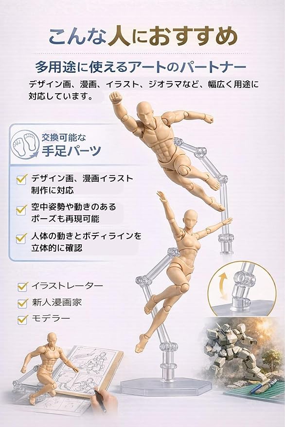 【カスタマイズ可能な手足パーツ】好みのアレンジができる手足パーツが付属しています。実際のモデルでは難しいスタイルやアングルを再現できるため、アーティストの創造性を広げます。また、安定感のあるスタンドが付いており、理想のポーズをしっかりと保持することができます。