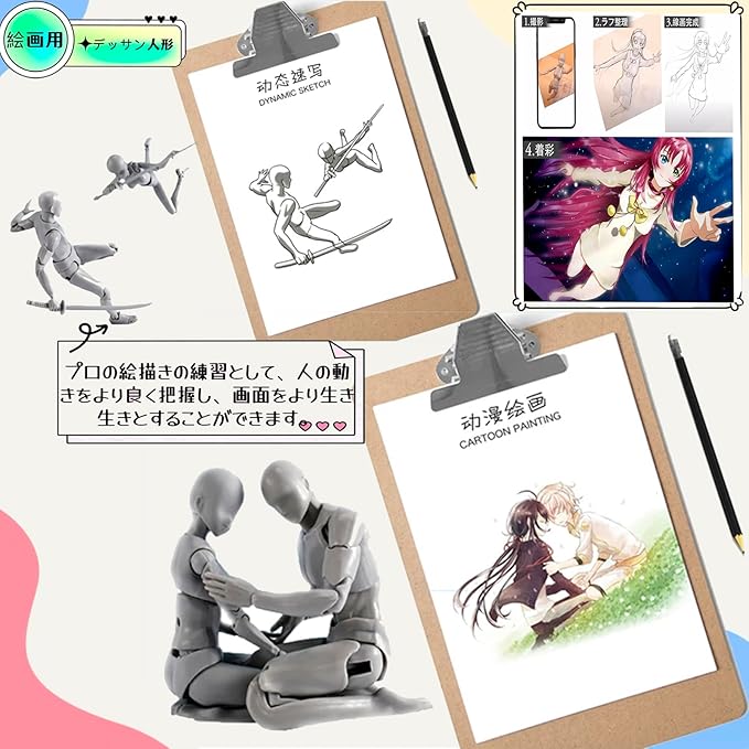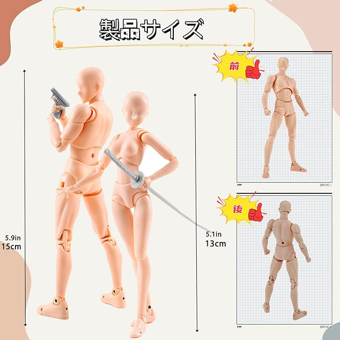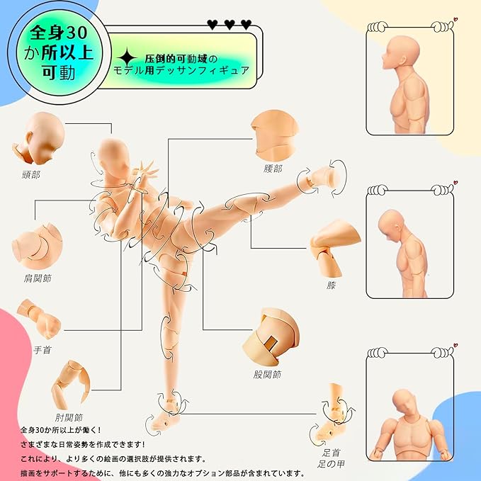✅✅【全身改良版!圧倒的な30可動関節】 「バリの目立ち」「関節の緩さ」「パーツ交換の難しさ」「可動の硬さ」といったお声に応え、改良を重ねました!!全身30ヶ所以上の関節にこだわり、あらゆるポーズを再現。あなたの思い通りにポーズを決められ、あらゆる角度からの観察とデッサンを可能にします。男性モデル:全長約14cm、女性モデル:全長約13cm。対象年齢:15歳以上