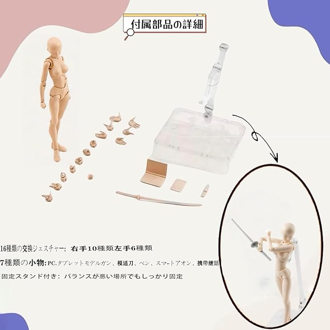✅✅【内容物】 本体、交換用右手首10種、交換用左手首7種、小物(ミニブック、PC、タブレット、ペン、スマートフォン等)、携帯電話、専用台座、ケース+手首ホルダーが付属。気軽にパーツを取り替えて好きなポーズを取らせることが可能。手足のパーツも豊富で、指先の細かい動きまでリアルに表現できます。パーツ交換は簡単で、思い通りのポーズを簡単に再現可能。