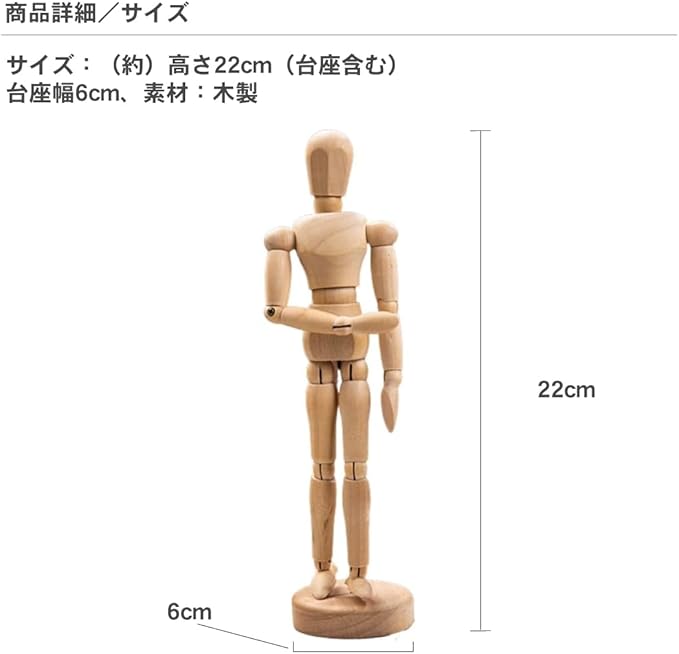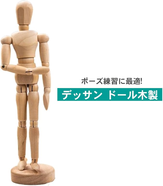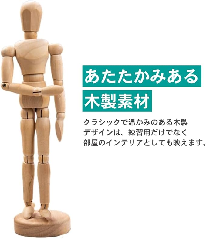 耐久性に優れた木製素材を使用したデッサン人形です。15か所の関節が自由に可動するため、ジャンプや空中動作など多様なポーズの再現が可能です。人体のバランスや構図の練習に最適で、美術系学生からイラスト・漫画を描く方まで幅広くご使用いただけます。木のぬくもりを感じられるデザインはインテリアとしても映え、デスク上のアクセントにもなります。付属の台座により自立が可能で、観察しながらの描画にも便利です。