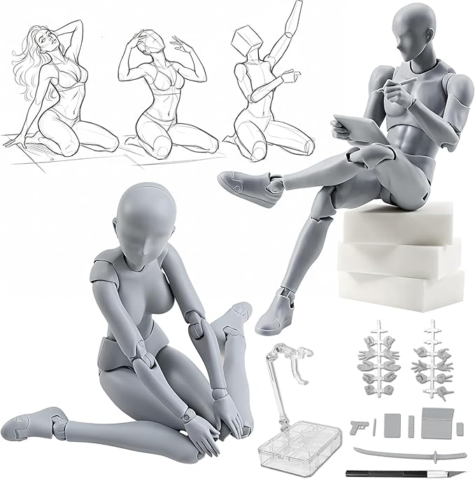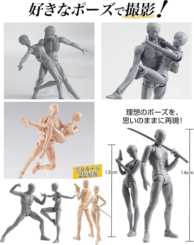 ✅【全身改良版!圧倒的な30可動関節】 「バリの目立ち」「関節の緩さ」「パーツ交換の難しさ」「可動の硬さ」といったお声に応え、改良を重ねました!!全身30ヶ所以上の関節にこだわり、あらゆるポーズを再現。あなたの思い通りにポーズを決められ、あらゆる角度からの観察とデッサンを可能にします。男性モデル:全長約14cm、女性モデル:全長約13cm。★便利な付属品:デザインナイフ(刃1枚付き)、仕上げの細かなバリ取りに最適!※ご使用の際は、ケガに十分ご注意ください。コンパクト(約13-14cm)で軽量(約100g)なため、収納や持ち運びにも便利です。