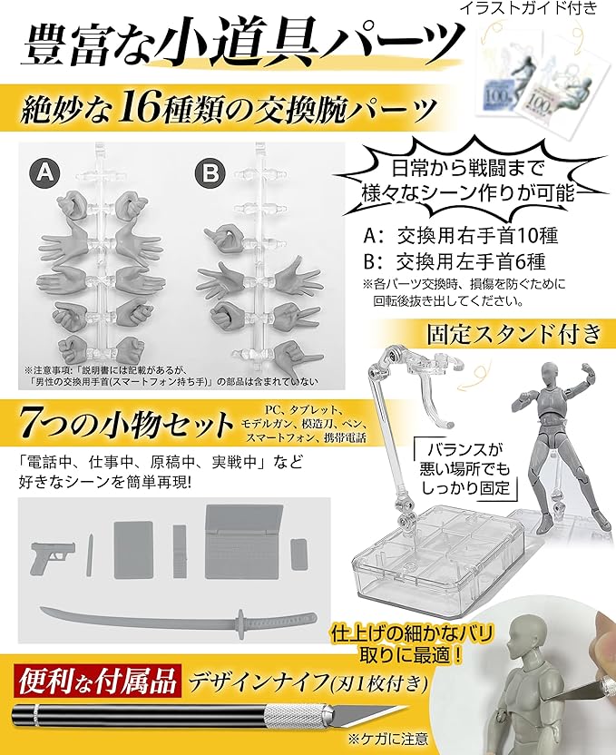 ✅【豊富な付属品で表現の幅が広がる・男性版・女性版の内容物】 本体、交換用右手首10種、交換用左手首7種、小物(ミニブック、PC、タブレット、ペン、スマートフォン等)、携帯電話、専用台座、ケース+手首ホルダーが付属。※ケースは台座で蓋をすることができます。気軽にパーツを取り替えて好きなポーズを取らせることが可能。手足のパーツも豊富で、指先の細かい動きまでリアルに表現できます。パーツ交換は簡単で、思い通りのポーズを簡単に再現可能。対象年齢:15歳以上