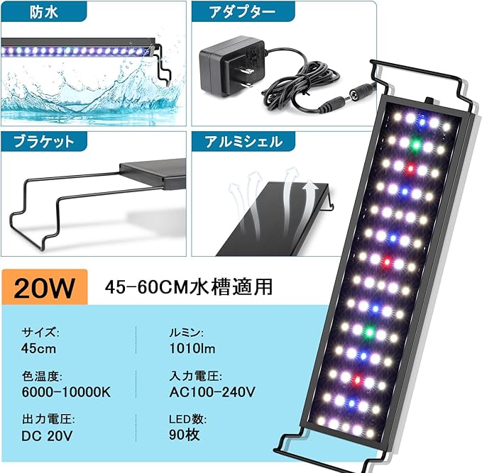hygger 水槽ライト 45-60CM対応 6/10/12Hタイマー 24/7自然モード 時間設定可能 7色ライト+フルスペクトル RGB 5段階明るさ調整 7色循環点灯 90LED アクアリウムライト 防水 観賞魚飼育 水草育成用 20W