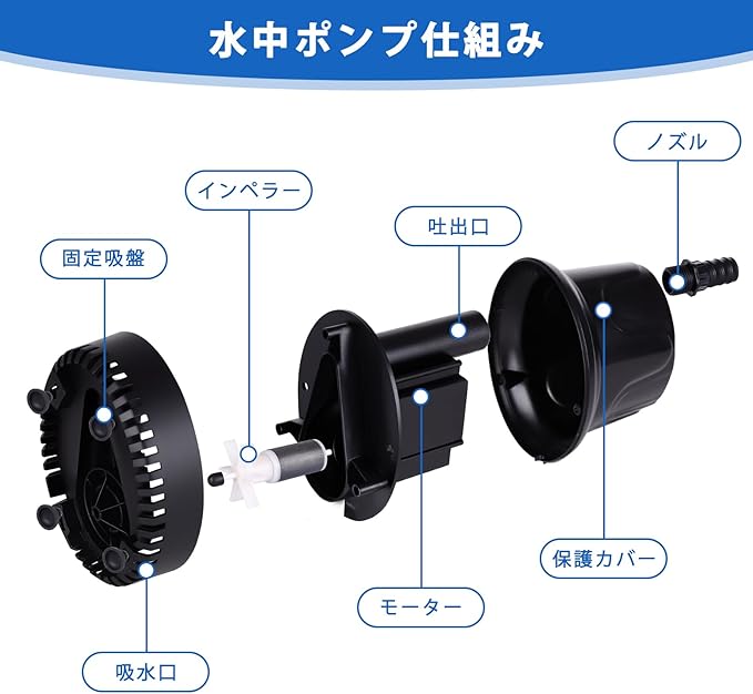 【安定性高い】給水ポンプは19mm、22mm、25mmの3つの異なるノズルを含みます。各ノズルのサイズによって提供する水の流れも違います。ごニーズに応じて選択することをお勧めです。水槽ポンプの底部には強力な吸盤が4枚付き、安定性が高く、騒音低減効果が良いです。水槽壁にしっかりと固定され、適度な水流を作ることで、魚たちがより活発に泳ぐ姿が楽しめます。