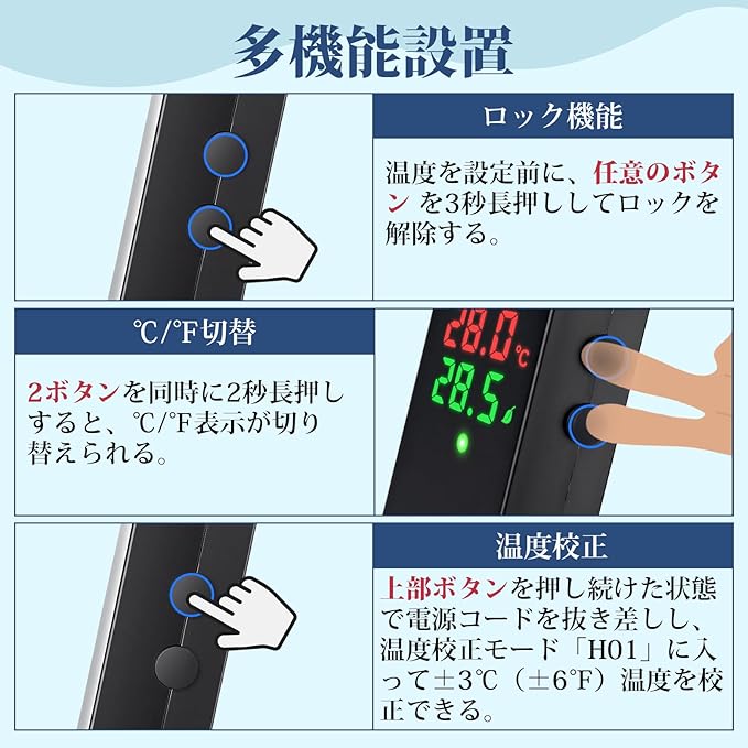 【温度校正機能】上部ボタンを押し続けた状態で電源コードを抜き差しし、画面に「H01」が表示されたら温度校正モードに入ります。小数点の前後の桁が点滅している間は、上部/下部ボタンで校正温度を調整できます。設定後、表示の点滅が数秒で止まれば校正完了です。校正可能範囲は 3℃( 6℉)であり、これを超えると全ての校正値がクリアされますのでご注意ください。