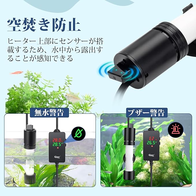 【ブザー搭載・空焚き保護】水槽ヒーターには警告ブザーが搭載され、正常に作動しない場合には自動的にブザー音が鳴ります。また、ヒーターが水中から露出して空気中にさらされると、自動的に電源が遮断され、ブザー音が鳴ります。同時にディスプレイ上の無水アイコンが点滅し、異常状態を知らせます。