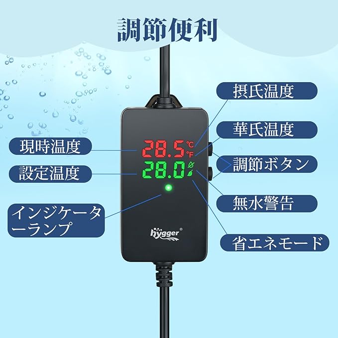 【15~34℃調節・ロック機能】水槽ヒーターはコントローラーが付き、上下の2ボタンで水温を精度 0.5℃で15~34℃にコントロールでき、魚種や生体の状態に合わせた水温設定が可能です。子供の誤操作を防止するため、ロック機能が搭載します。操作前に任意のボタンを3秒長押ししてロックを解除してください。