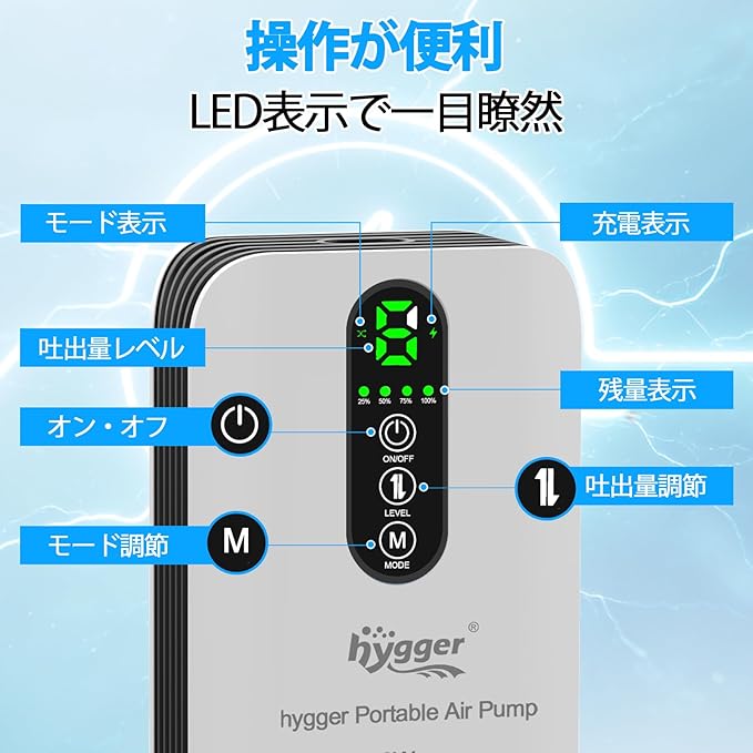【6段階送風・USB充電】6段階送風の調節機能付きの酸素ポンプが便利です。USB充電式なので、スマホのように充電して使用できます。4つのランプが残量を表示してくれるので、充電し忘れのことが防止できます。本製品はAC電源を使用する通常のエアポンプとして動作可能で、停電時には自動でDC電源(電池駆動)に切り替わります。