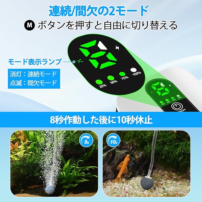 【連続モード・間欠モード】エアーポンプは連続モードと間欠モードの2種類の運転モードを搭載しており、Mボタンを押すと切り替えられます。間欠モードでは8秒作動した後に10秒休止するサイクルを自動的に繰り返します。連続モードでは約16-48H、間欠モードでは約39-109H使用が可能なので、長時間の釣行でも安心です。