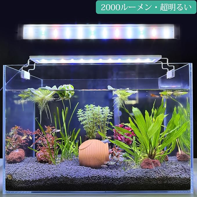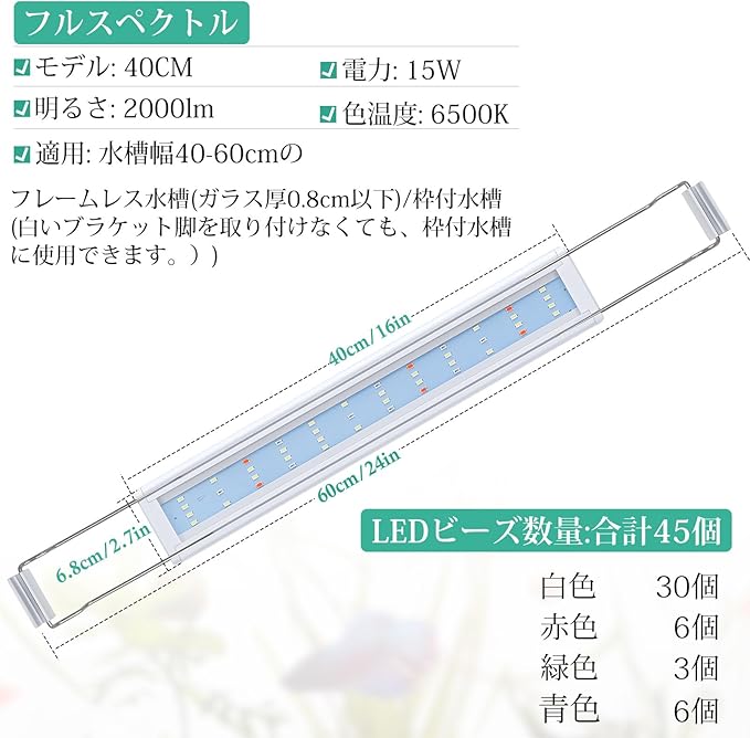 このFEDOUR40㎝水槽LEDライトは、水槽幅40~60㎝のフレームレス/枠付水槽に適しています。パワー15W、色温度6500 K、2000lm超高輝度。水草の成長、水槽の照明に適用します。