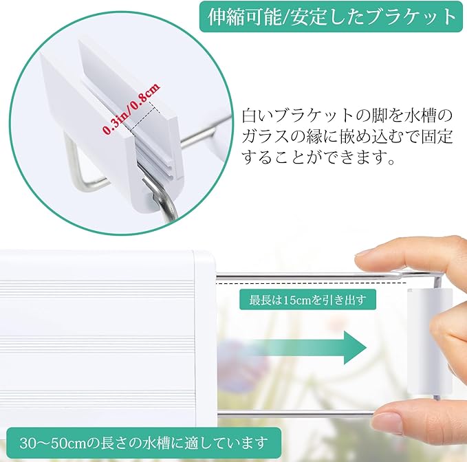 「伸縮可能の安定したブラケット」: この水族館植物ライトのブラケットは、両端で約 15㎝調整できます。 独特な固定用ブラケット足により、この水槽ランプが水槽上でより安定し、フレームレスのガラスの厚さが0.8㎝以内の水槽に適しています。白いブラケット脚を取り付けなくても、枠付水槽にも使用できます。