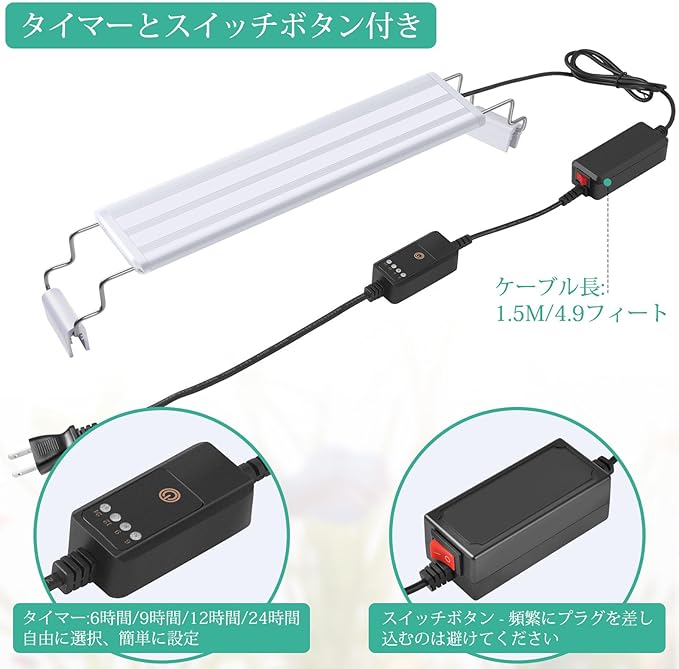 「タイマー+オン/オフボタン付き」:設定が簡単なタイマーボタンを使用して、この水槽ライトの点灯時間(6時間/9時間/12時間/24時間)を自由に設定できます。N・OFFスイッチが付き、使いやすくなりました。