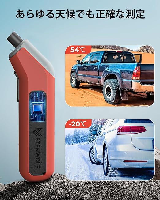極端な気象条件での精度:内蔵AIチップと温度補正機能により、ETENWOLFのタイヤゲージは極寒や猛暑(-20 C~54 C)でも正常に動作します。