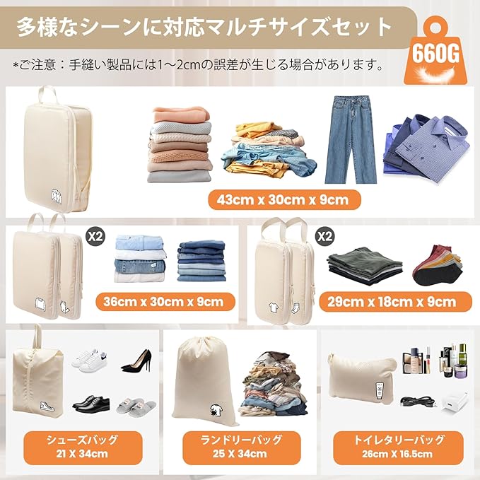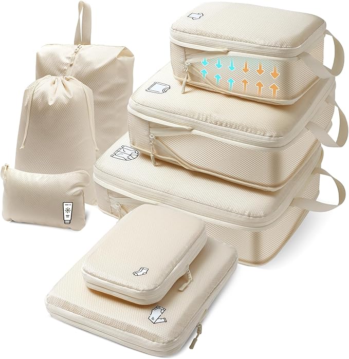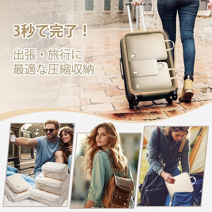 Samfolk トラベルポーチ 旅行用圧縮袋 旅行用ポーチ 圧縮バッグ セット 圧縮袋 旅行 パッキングポーチ 旅行便利グッズ 衣類仕分け 出張 大容量 防水 小物入れ トラベルセット 下着収納 巾着袋 スペース節約(ベージュ,8点)