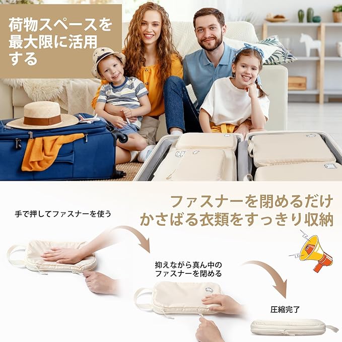 【かんたん圧縮でスペース50%OFF】特別設計の強化SBSファスナーを閉めるだけで衣類を簡単圧縮。面倒なポンプや専用器具は不要なので、お子様からご年配の方まで誰でもラクラク操作可能。かさばる衣類もコンパクトに圧縮できるから、スーツケースの収納効率が劇的にアップ!