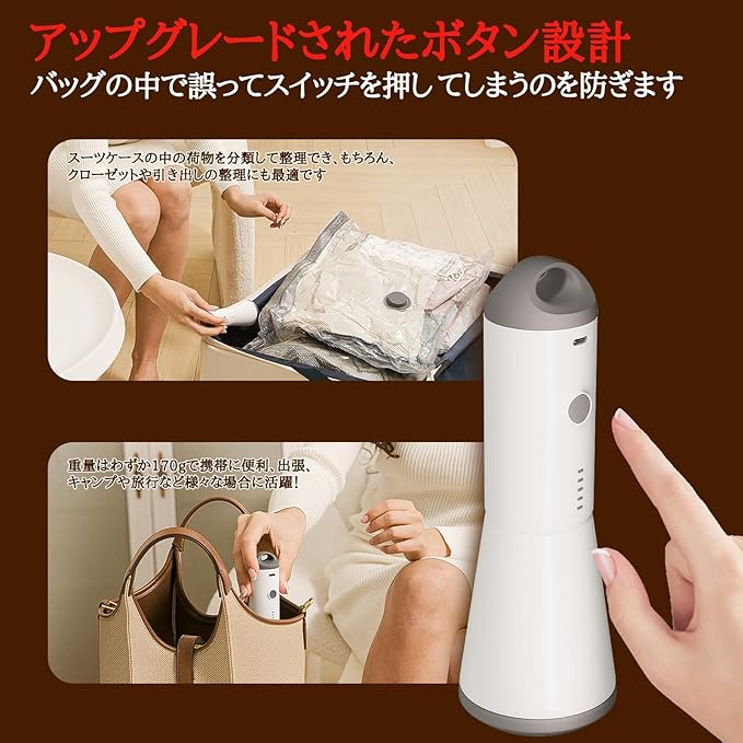 【アップグレードされたボタン設計】 アップグレードされたボタンのデザインにより、旅行中に誤ってスイッチを押すことを防ぎます.なお、この圧縮袋 吸引機には過熱保護機能が搭載されて、使用する際にさらに安心が持てるようになります.スリムで持ちやすく、片手でも楽に使えます.