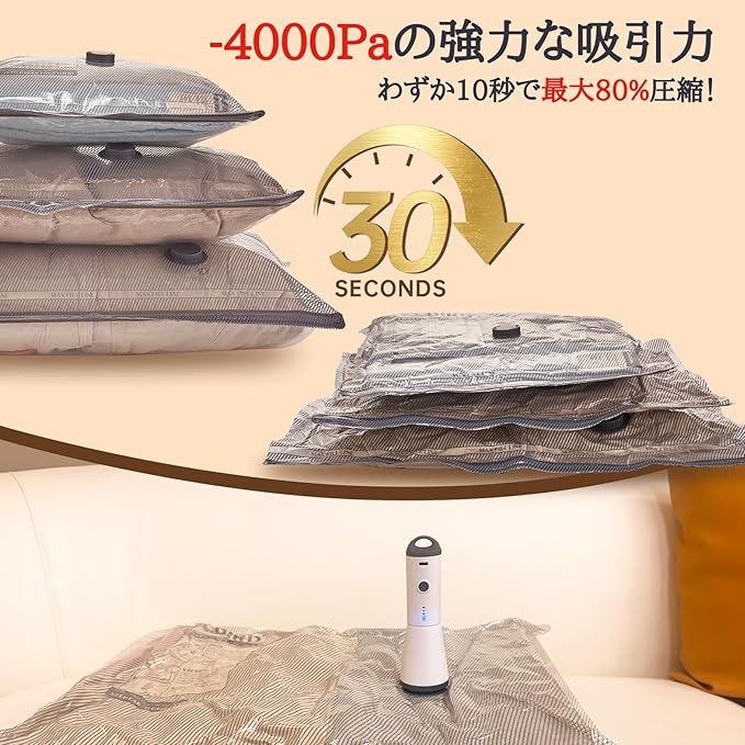 【わずか10秒で80%圧縮!】 当社の旅行用圧縮袋は電源や掃除機不要で、アウトドアでも迅速に圧縮できます.4000paの強大な吸引力によりわずか10秒で80%まで圧縮可能です.荷物の分類や整理に最適で、自宅での収納にもぴったりです.軽量で持ちやすいので、この真空収納バッグセットは海外旅行/修学旅行、アウトドア活動でも人気があります.