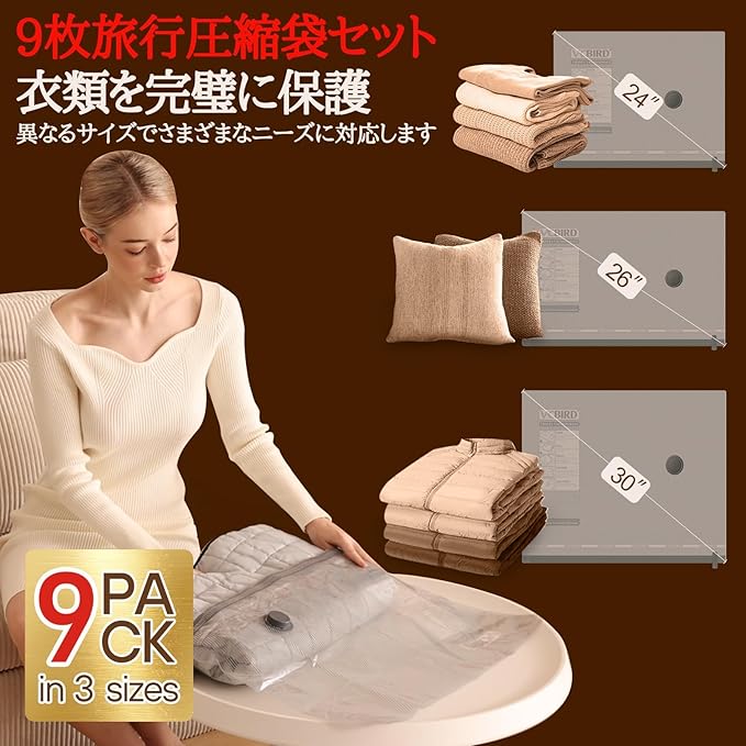 【最大80%のスペース節約】 9枚旅行圧縮袋セット:40*50cm*3枚、40*60cm*3枚、50*60cm*3枚、およびコードレス充電式ポンプ*1が付属.異なるサイズでさまざまなニーズに対応できます.季節の変わり目に不要な衣類を真空袋に入れて整理できるので、クローゼットや引き出しをきれいに保つことができます.そして、旅行や出張の際には、スーツケースの中の荷物を分類して整理し、より多くのスペースを節約できます.