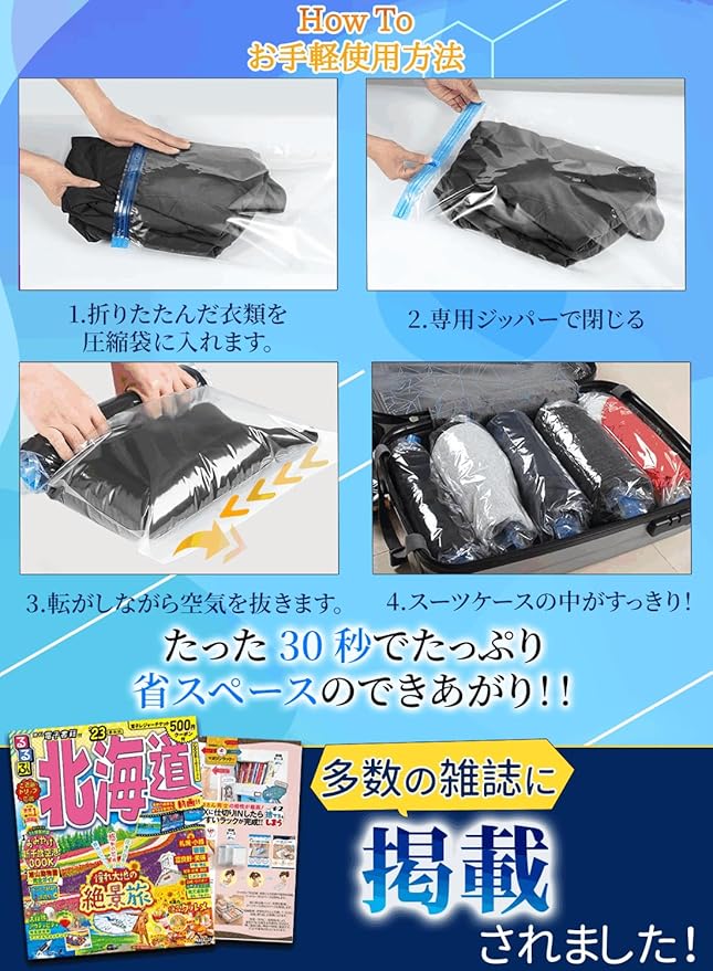 【旅行・衣替え必須!超強力圧縮】アウトドア旅行時、衣類を圧縮袋に入れると携行荷物の重量を約半分に軽減。一泊旅行でも、2〜3泊分の荷物が楽に収納可能。収納時は圧縮袋を平らに広げるだけで、セーターやコートなどの大型衣類を体積の1/2から1/4に圧縮!より整理整頓されたクローゼット空間を実現します。