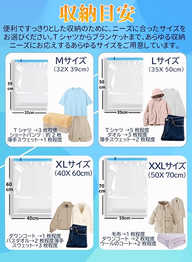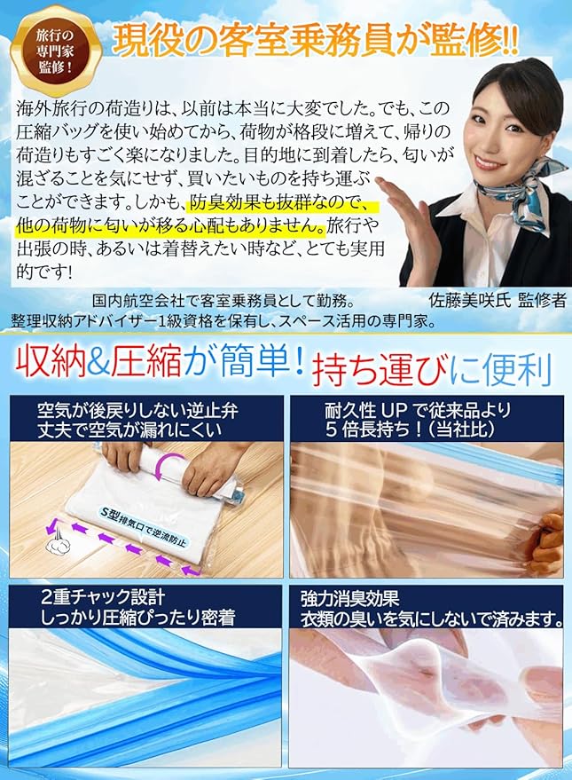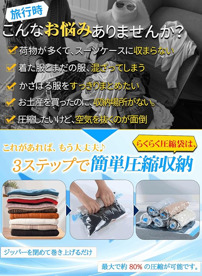 【高品質の素材、漏れ防止】厚さ80ミクロンの旅行用衣類圧縮袋。従来製品より頑丈で耐久性が5倍向上。快適性と耐久性を兼ね備えています。圧縮後も空気が逆流しにくく、荷物の長時間の膨張を防止。旅行中の荷物のずれやかさばりを効果的に防ぎ、スーツケースの空間を最大限に活用。衣類をしっかり固定して整理しやすく、出張や帰省旅行に最適です。