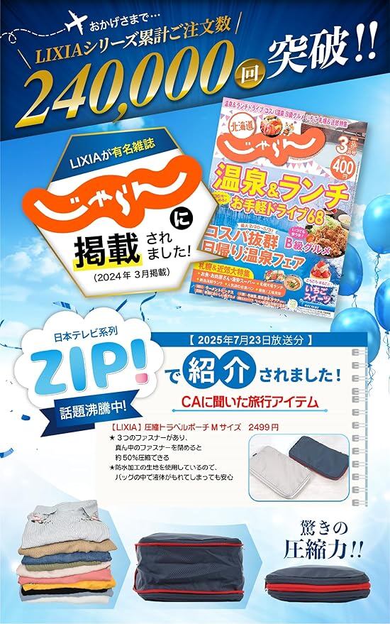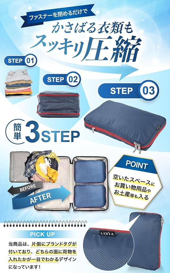 【日本テレビ ZIP! で放送】LIXIA 旅行用圧縮袋 YKK 圧縮袋 旅行 2Way じゃらん掲載 スペース節約 ダブルファスナー トラベルポーチ (L, ネイビー)