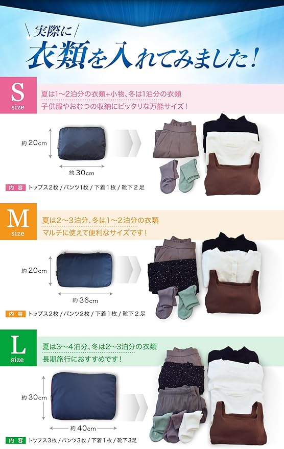 ✅【こんなシーンで活躍】 旅行に。 荷物を最小限に抑えたい出張などに。 着替えを用意しておきたいキャンプに。 クローゼットで使用頻度の低い衣類の収納にも。ちょっとしたお出かけにも必須の一品。