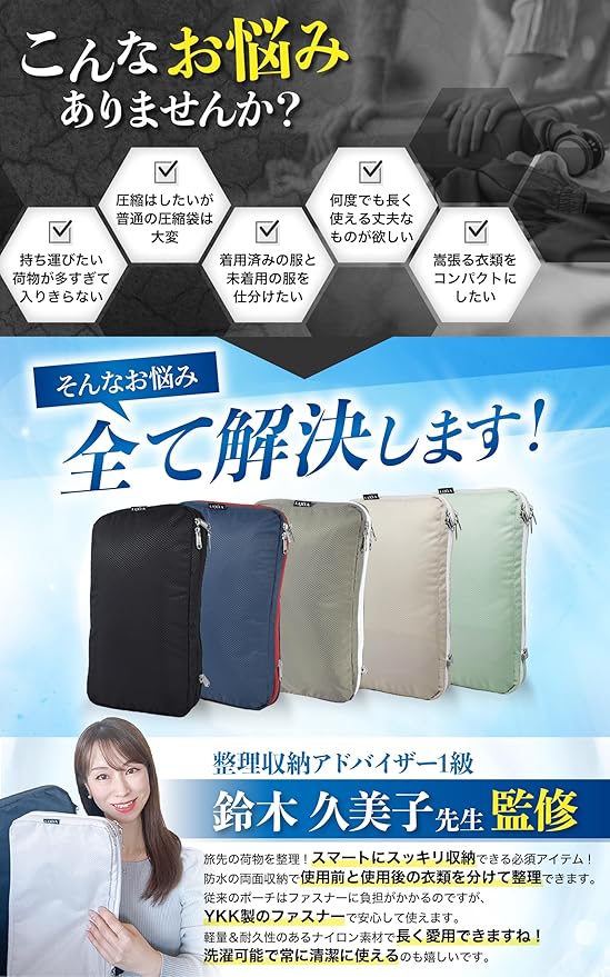 ✅【ファスナーを閉めるだけで簡単圧縮】 かさばる衣類があっという間にスッキリ!衣類を畳んで納め、チャックを閉めるだけで約50%圧縮できるバッグです。是非LIXIAの圧縮バッグで荷物に囚われない旅行をお楽しみください!