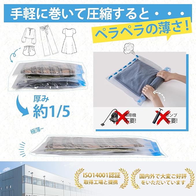 圧縮袋 旅行 衣類圧縮袋 40*60cm(5枚)約80%圧縮 真空あっしゅく袋 ブルー 掃除機不要 手巻き 洋服 ダウン アウター 防カビ 防虫 衣替え 収納 トラベル 出張 引っ越し 旅行便利グッズ 再利用可能