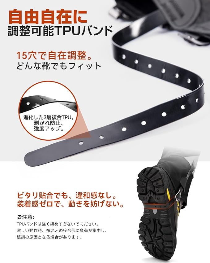 ⭐【体型を選ばないマルチサイズ設計】4サイズで幅広い体型にフィット。TPU調整ベルトは約25cmの長さがあり、厚底ブーツから軽装シューズまでしっかりホールド。側面のファスナー開閉と上部のドローコードで、すき間なくぴったりとフィットします。