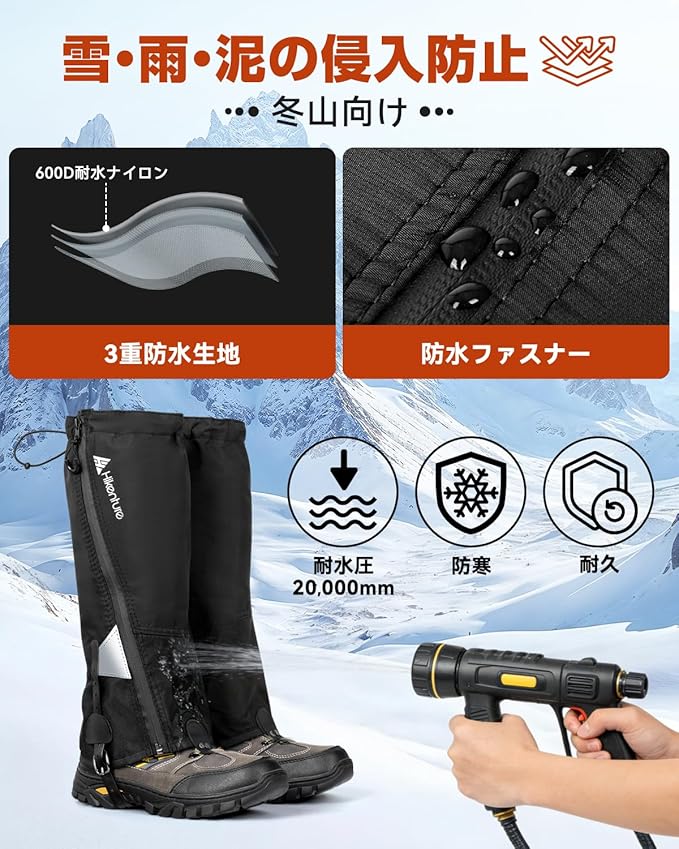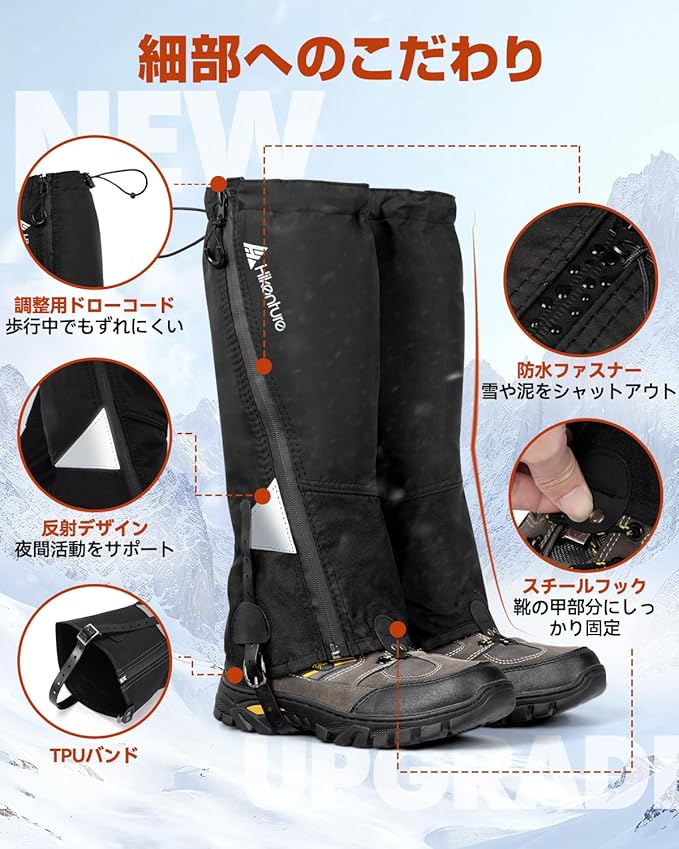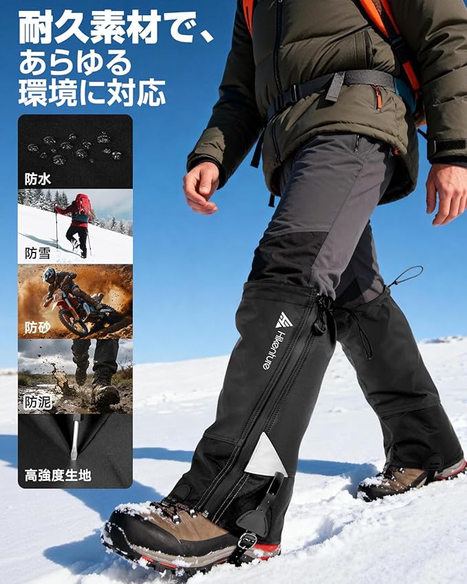 HIKENTURE ゲイター 【防水防風・冬山向け】ロング 登山 高耐久性 レッグカバー 軽量 登山スパッツ トレッキング アウトドア バイク 男女兼用 収納袋付き 泥除け 砂よけ 雨雪悪天候対策