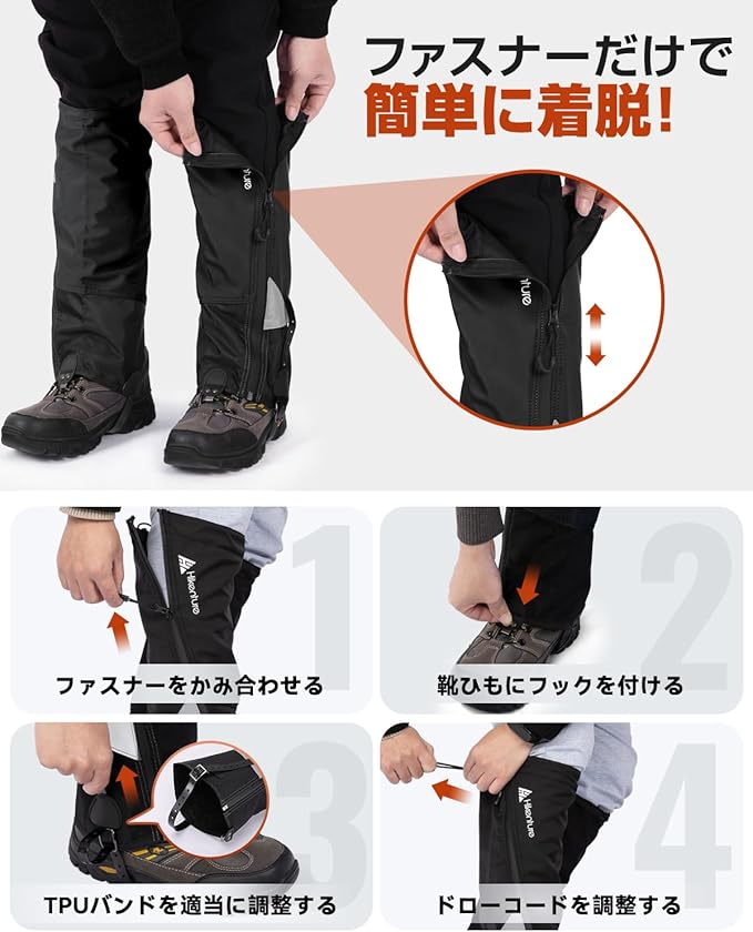 ⭐【着脱ラクラク、ずれない工夫が満載】HIKENTURE登山ゲイターはファスナー式で、付け外しが簡単。底面のTPUストラップはソールに密着し、歩行中のずれを防止。靴の甲にフックもズボン裾をしっかりキャッチするので、動きの中で緩む心配がありません。