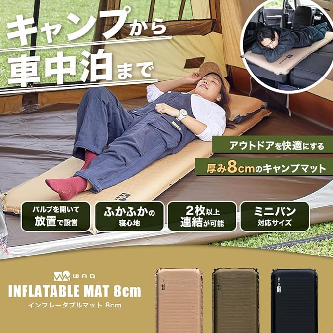 WAQ キャンプマット 車中泊マット 厚手 8cm コンパクト R値 6.0 特殊ウレタン 軽量 インフレーターマット (TAN)