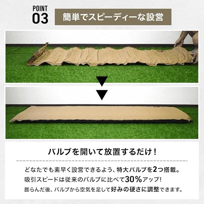 ✅災害時の睡眠にも役に立ちますので防災マットとしても車に積んでおけば安心です。✅【自動膨張!特大バルブ 2個搭載】バルブを開くと自動で空気が入ります!さらに特大バルブを2個搭載した事で膨張スピードを上げました!約3分ほどで使用できるまで膨らみます ✅【ズレない滑り止め加工】マット裏面には滑り止め加工を施していますのでフローリングの上や滑りやすい場所でも安定してご使用頂けます。